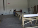 The next step is to lay out the material that will eventually become the air-form. Each dome will have a different number of gores. Each layer of material becomes one gore. WE layed out the number of layers of material based on the particular need of each dome.