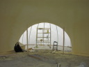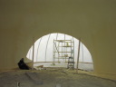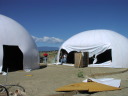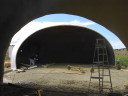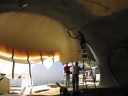 Pictured at the right we left the blower in the recently foamed front roomdome and just lifted the kitchen airform to inflate it. |