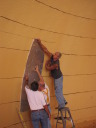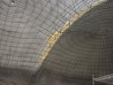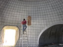 Once the airform has been inflated and the air lock is attached, the polyurethane foam is sprayed inside the dome. Successive layers are sprayed until the proper thickness is reached. This foam preforms the insulating function of the dome as well as the initial structural strength of the dome. |