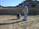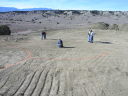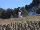 December 2002- We have done our final grading of the house site and have plenty of room for the house. Using marking paint we have drawn out our house on the ground. Sure wonder if its large enough just looking at the markings. Its very difficult to get a real idea of sizes when its one dimensional. Having disturbed a great deal of earth in the process of opening up the land for the house Beth is seeding the area with natural grasses. Also need to mention that we met with the county and got an agreement on how they wanted to inspect our dome. This being the first one in this county we felt it was worth the additional effort. Notice Beth's short sleeves in December!!